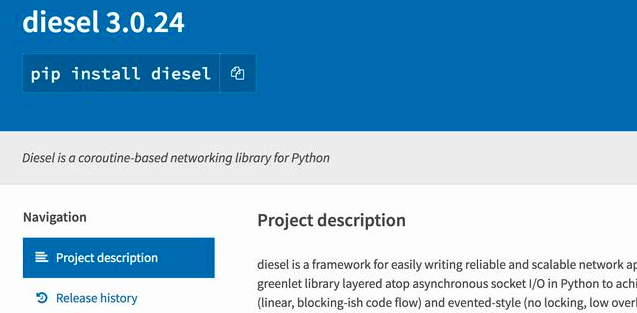 Diesel是基于Greenlet的事件I/O框架,它提供一个整洁的API来编写网络客户端和服务器。支持TCP和UDP。非阻塞I/O使得diesel非常快速并且容易扩展。
