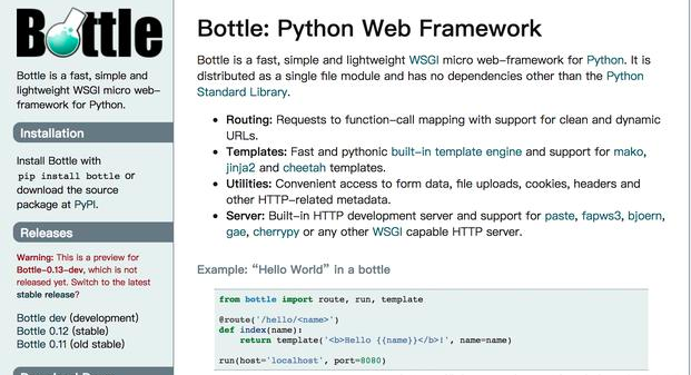 Bottle是一个简单高效的遵循WSGI的微型python Web框架。说微型,是因为它只有一个文件,除Python标准库外,它不依赖于任何第三方模块。
