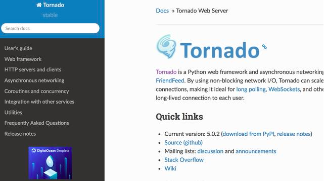 Tornado源意为龙卷风,这里是一款可扩展的,非阻塞的Web服务器,应用开发框架,以及异步联网库。它最初是在FriendFeed开发(在2009年被Facebook收购)。Tornado是高度灵活,专门设计为开发人员和第三方工具厂商提供了一个开放环境。已有部分应用程序接口可以利用并附带参考书目,内容从开发环境接口到连接实现。另外,它还配备了一个WSGI服务器,其他WSGI Python应用程序(和框架)也可以使用。在开源和Apache 2.0许可下可用。