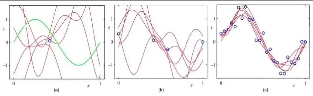 假设我们有一个类似于正弦分布的数据。在最极端的情况下如图 a ,我们只有一个样本,可以看到许多模型都可以很好地拟合这个数据点,但绝大多数模型都是过拟合,且在整个数据集上效果不是很好。当我们增加数据时,从图 b 可以看出可以拟合这些数据的模型逐渐减少。随着我们进一步增加数据点,我们最终会成功获得数据的真实分布。这个例子可以使我们很直观地了解数据量是如何帮助模型揭示数据的真实关系。接下来,我们将通过举例几个算法,看看模型的参数是如何受到数据量大小影响的。