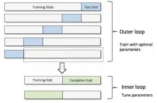 嵌套交叉验证的每个 fold 中都包含训练,验证和测试数据。在内循环中,我们将模型拟合到每个训练集来最大化模型得分,然后通过在外循环的验证集上选择超参数来得到最高分值。我们可以通过对不同交叉验证折叠中的测试得分求平均来估计样本外误差。Varma 和 Simon 在论文 Bias in Error Estimation When Using Cross-validation for Model Selection 中指出使用嵌套交叉验证得到的测试集误差几乎就是真实误差。