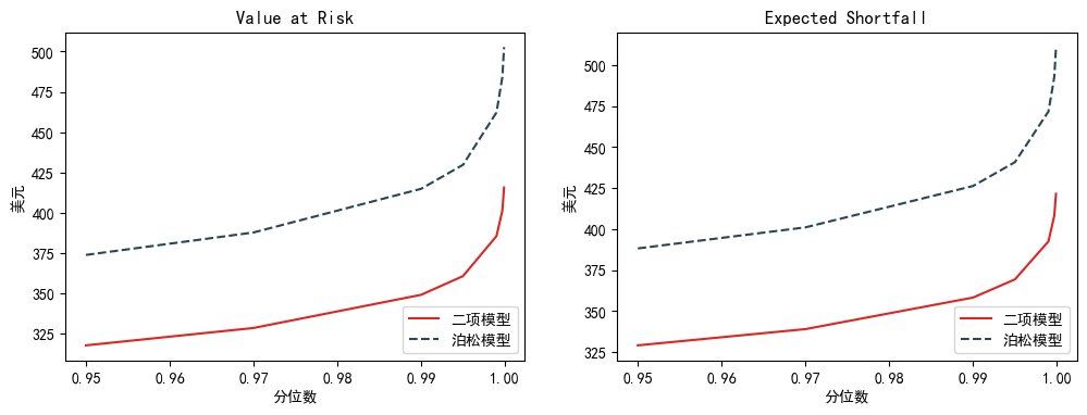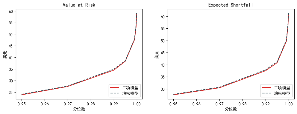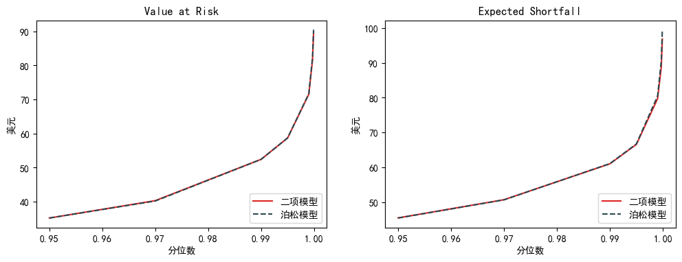 当 p = 0.25 时,差别很大,两个模型的表现不再一致,泊松模型在每个分位数下计算出的 VaR 和 ES 比二项模型的都大。