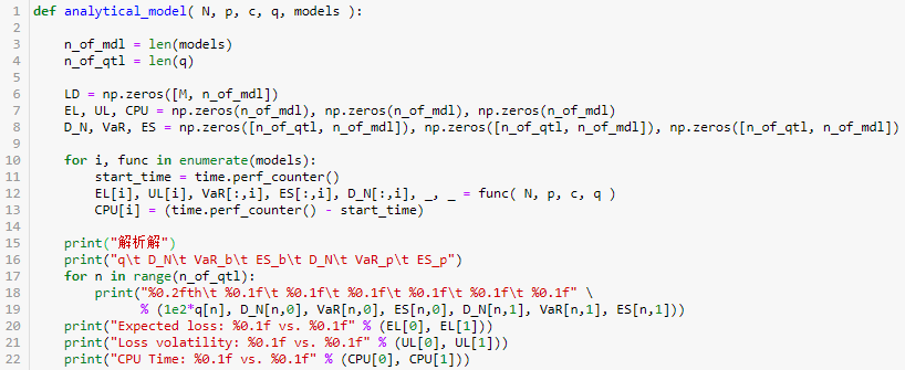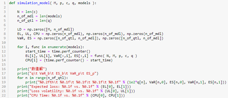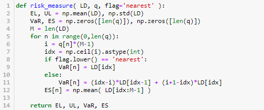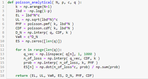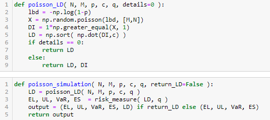 编写三个函数,分别计算损失分布(poisson_LD),计算风险指标(risk_measure)和整体模拟(poisson_simulation)。代码很简单,按照 1.1 的公式和逻辑就能轻易实现。