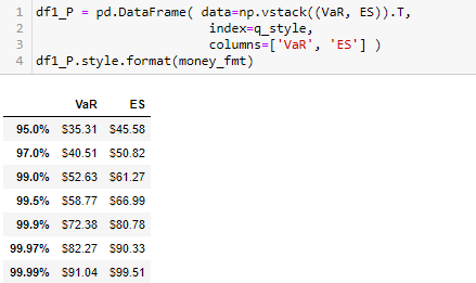 打印出在不同置信度下的 VaR 和 ES 值,都是递增的。