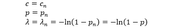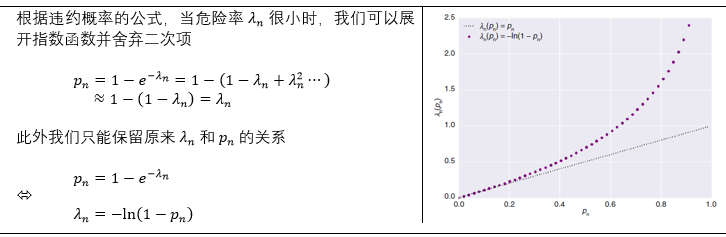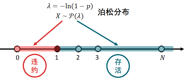 该随机变量 Xn 可以是离散型或连续性,以上这种指定违约的模式打开了很多的建模可能性。如果以伯努利分布(二项分布)为起点,我们很自然的会联想到泊松分布 (Poisson distribution),该分布是对一段时间某种事件发生的次数建模的。如果把事件想成违约,那么该事件发生一次和一次以上就是违约,即 Xn ≥ 1,发生零次就是存活,即 Xn < 1。
