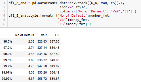 打印出在不同置信度下的违约总个数 DN,VaR 和 ES 值,都是递增的。