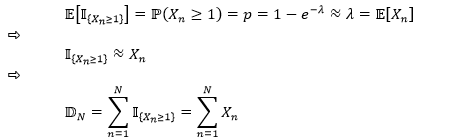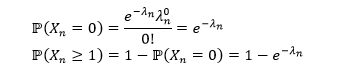第一步推导用到了泊松分布的性质;第二步推导认为当 λ 很小时,Xn 可近似看成一个二元变量,一种情况等于 0 (概率很大为 1– p),一种情况等于 {1,2,3, …} (概率很小为 p)。第三步应用推导结果把
