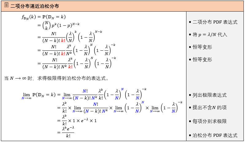 当 p 足够小和 N 足够大时,二项分布逼近泊松分布。从二项分布的 PDF 开始,将 p = λ/N 带入,并求得当 N 趋近无穷时的极限。证明过程如下: