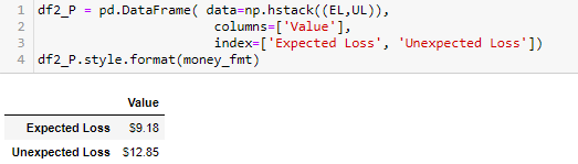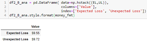 打印出该组合的 EL 和 UL 值,它们对于不同的置信度的都是一样的。我们可以看出极端损失(VaR, ES)要比 UL 大,因此损失波动率并不是一个可能捕捉注组合风险的好指标。