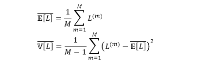 将上面过程重复 M 遍得到 L(1), L(2), …, L(M),再根据均值和方差的定义来计算它们(用 hat 表示它们是估计量而不是数学定义)