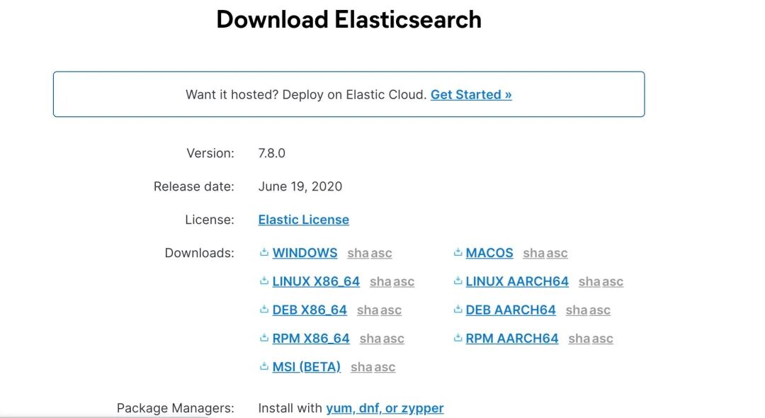 登录https://www.elastic.co/cn/downloads/elasticsearch,选择相应的系统环境下载软件包,小编我采用的是CentOS,所以选择Linux环境。