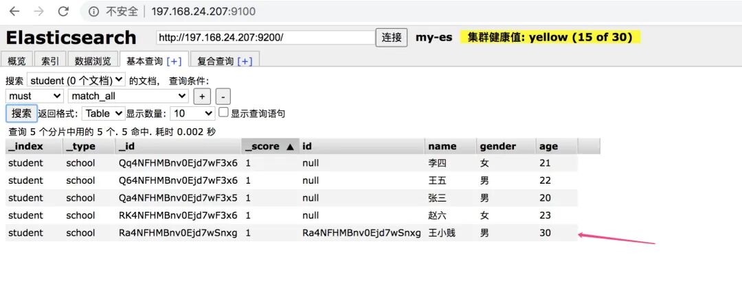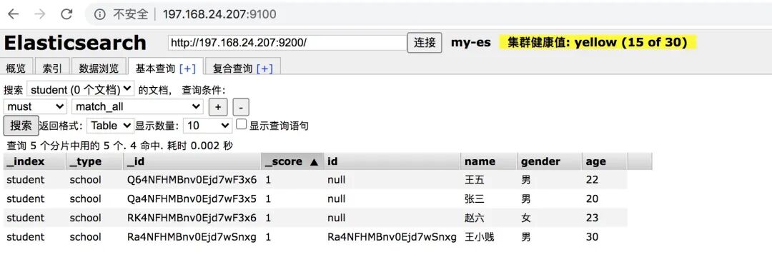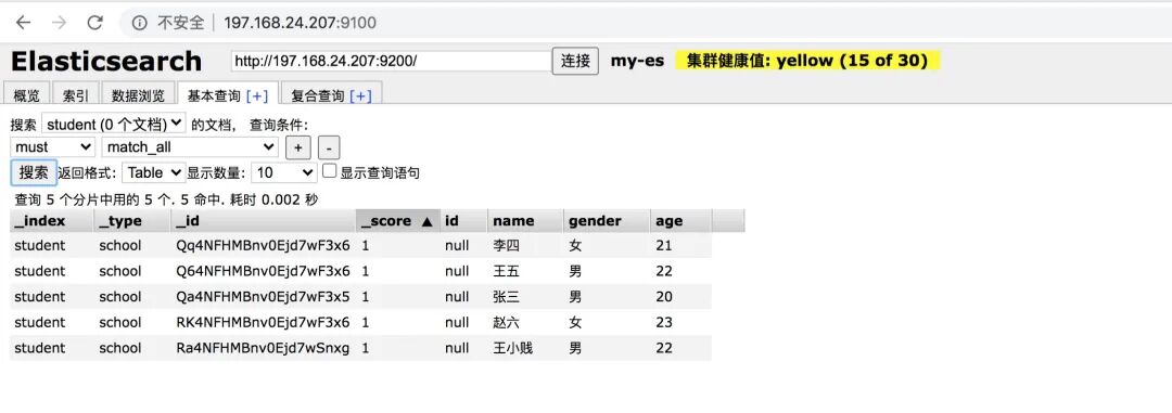 执行之后,登录可视化界面查询界面,选择索引student,可以很清晰的看到数据已经进去了