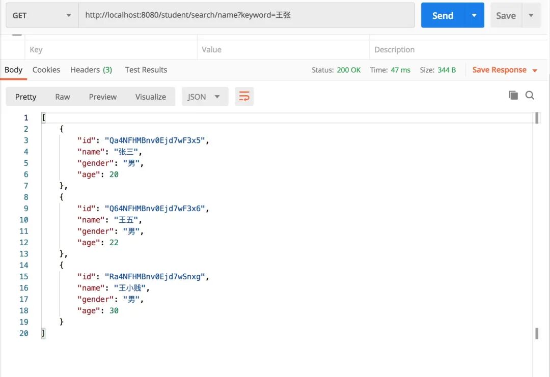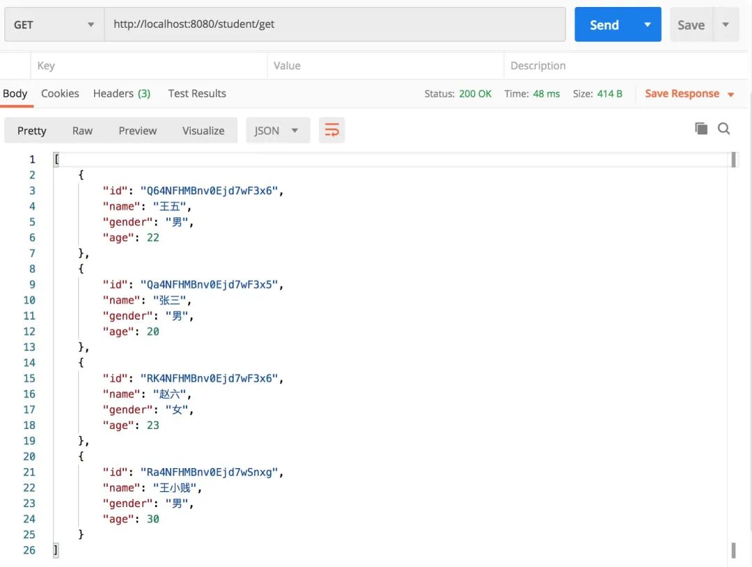 CRUD 编写完了,我们验证一下是否可以正常操作,启动 springboot 项目,使用 postman 进行测试。