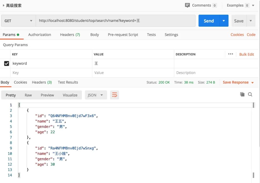 - 查询功能测试,高级查询,这个是使用官方api提供的查询入口,可以在方法中进行自定义搜索