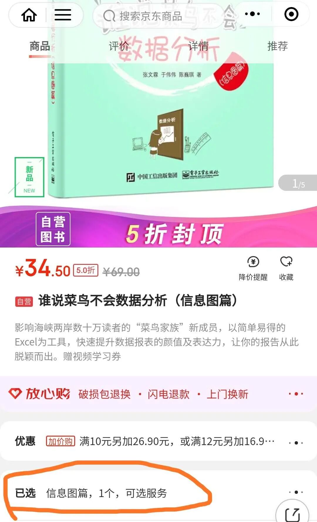 另外《谁说菜鸟不会数据分析(信息图篇)》在京东也已经上市了,也是半价,昨天还不是呢,只是小程序的链接才没有出来,需要的话直接点下面任一链接进入,点击下方【已选】项选择【信息图篇】就可以购买了。