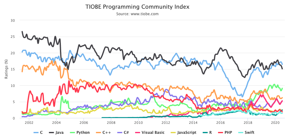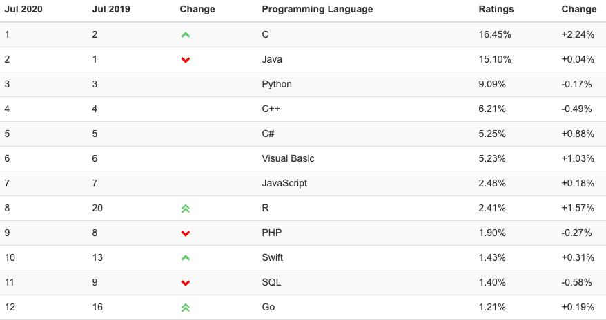 2020 年 7 月 TOP 10 编程语言的趋势走向