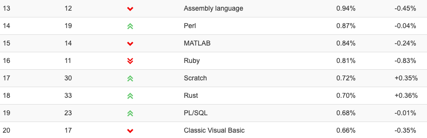 本月其他有趣的变动还有:Rust(从20 位升到 18 位),Kotlin(从 30 位升到 27 位)和Delphi / Object Pascal(从 22 位升到 30 位)。