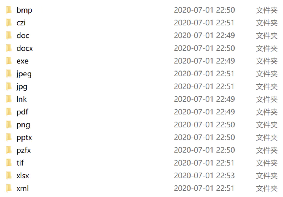 具体的功能很简单,给定一个打算整理的文件夹目录,这个脚本可以将该目录下的 所有文件 都揪出来,并且根据后缀名归类到不同的文件夹里,就像下图一样,简直是整理爱好者的福音