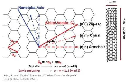 不同的n和m值可以得到不同类型的碳纳米管,一般来说:当m=0时,得到的是Zig-zag型;当m=n时,得到的是Armchair型;介于两者之间则是Chiral型。