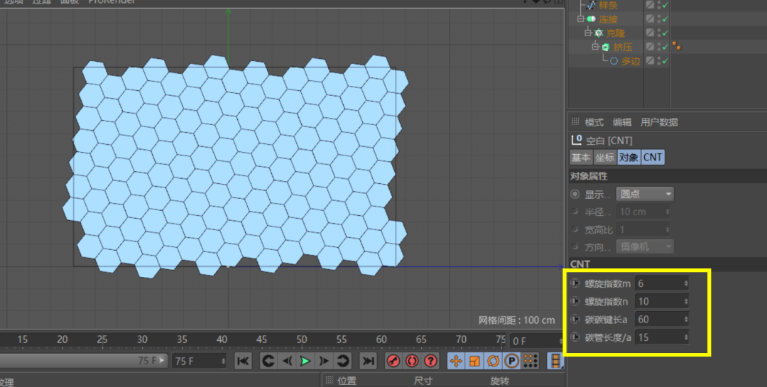 按照这一思路,我们在C4D中先创建出蜂窝状的克隆平面,然后在平面上框选出不同大小的矩形,最后卷曲360°即可得到碳纳米管。随着矩形和六边形蜂窝平面之间的夹角变化,便可以在不同类型之间切换。