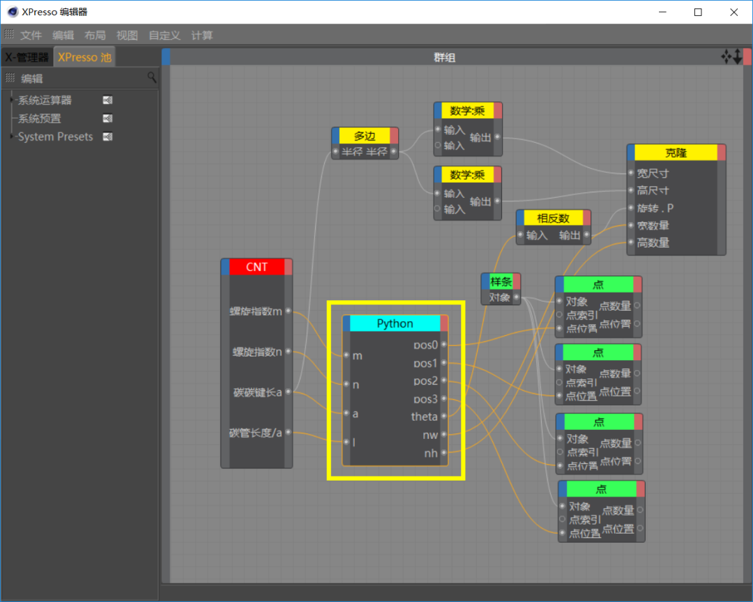 当然,XPresso编辑是少不了的。这里用到了Python节点,C4D中的Python编辑最大的特点就是经常会用到矢量。毕竟是三维软件,不管是尺寸、位置还是角度、速度,都可以用矢量来表示。所以一些常用的矢量相关的函数可以稍作了解,比如c4d.Vector()、VectorAngle()、GetLength()等。熟能生巧,写得多了,自然而然就有经验了。