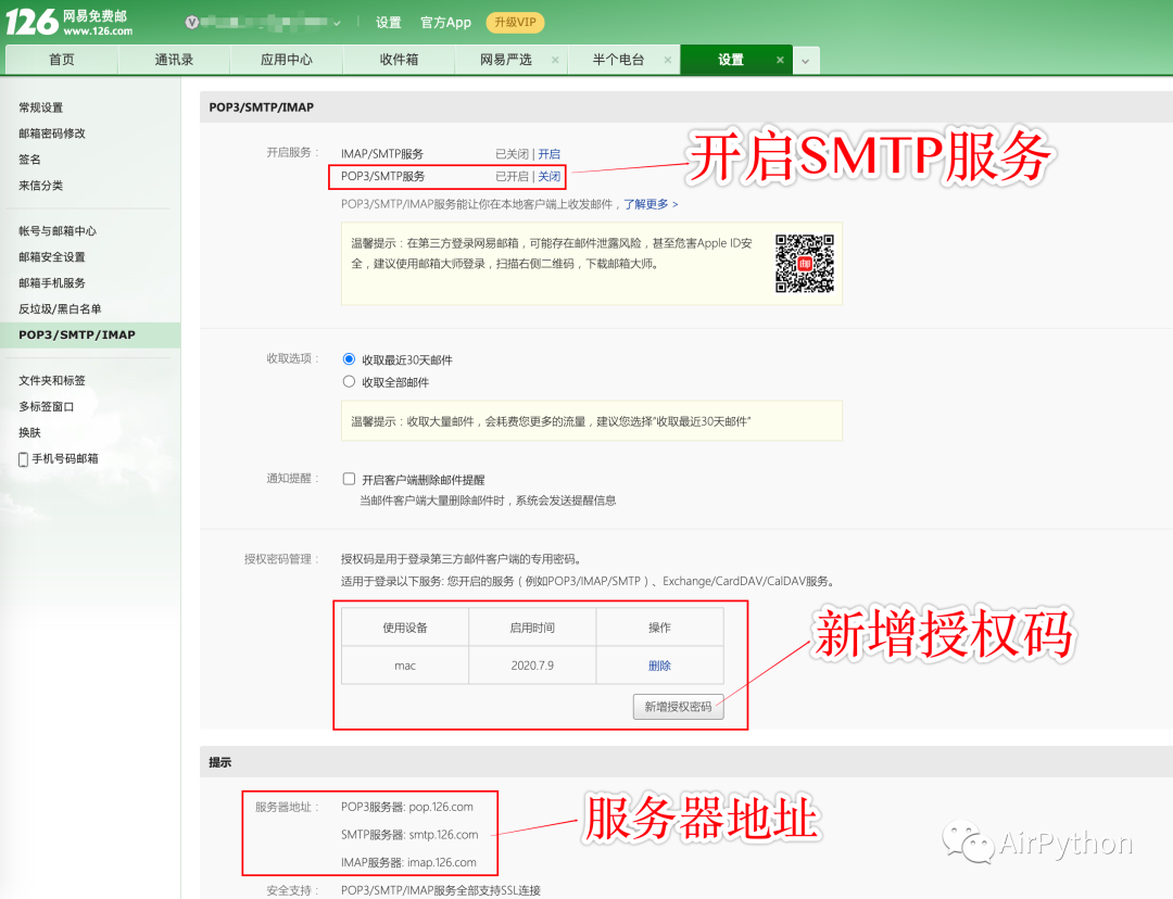 以 126 邮箱为例,在编码之前,我们需要开启 SMTP 服务