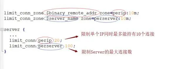 limit_conn perip 20:对应的key是 $binary_remote_addr,表示限制单个IP同时最多能持有20个连接。