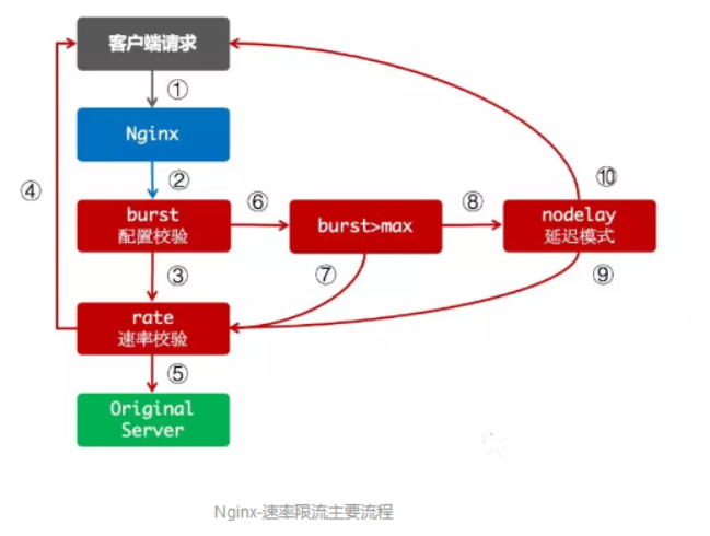 按上面的配置在流量突然增大时,超出的请求将被拒绝,无法处理突发流量,那么在处理突发流量的时候,该怎么处理呢?Nginx提供了 burst 参数来解决突发流量的问题,并结合 nodelay 参数一起使用。burst 译为突发、爆发,表示在超过设定的处理速率后能额外处理的请求数。