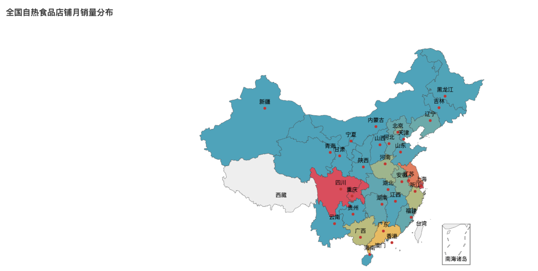 map1.set_global_opts(title_opts=opts.TitleOpts(title='全国自热食品店铺月销量分布'),