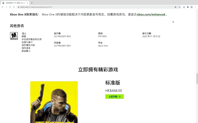 比如我想要关注 Xbox 版的《赛博朋克 2077》何时降价,就可以前往 Xbox 官网,找到该游戏的详情页,对其价格设置监控。一般游戏的打折都会持续几天,因此每天检查一次就足够了。