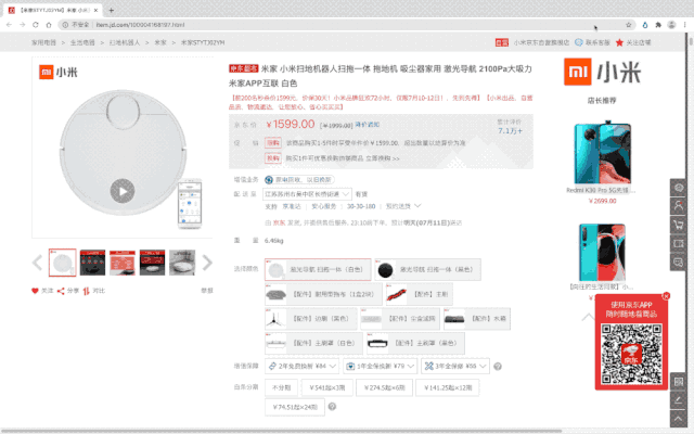 以监测商品价格为例,在商店下载好 Chrome 浏览器插件后,先打开商品页面,比如京东的小米扫地机器人。再点击右上角的《Distill Web Monitor》图标,开始配置监测器。