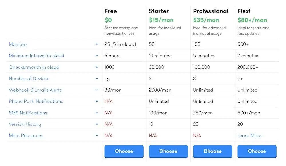 $15/月的个人版或 $35/月的专业版提供了更大数量的监测器、更高的监测频率、更多的检查次数以及更多甚至无限次的邮件通知。