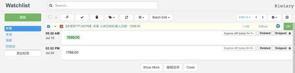 通过上图可以看到,我在 7 月 4 日对小米扫地机器人设置监测器时价格为 1799 元,到了 7 月 10 日则降到了 1599 元。通过页面监测保证不会错过重要商品的打折,实属羊毛党的利器。