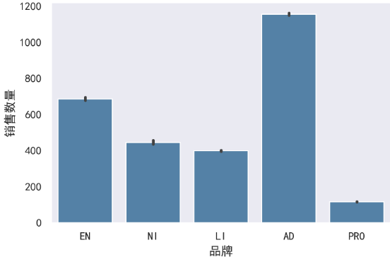 sns.barplot(x="品牌",y="销售数量",data=df,color="steelblue",orient="v",estimator=sum)