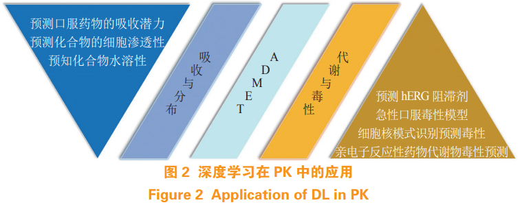 图 2 分别从药物的吸收、分布、代谢与毒性几个方面举例了 DL 应用。以 PK 的关键性质之一水溶性为例,药物的水溶性将直接影响化合物在生物体中的吸收。Li 等建立了基于半监督学习模型的多层深度信念网络 ( deep belief network,DBN) 来预测化合物的水溶性,准确率达到 85.9%。不只是吸收分布的 PK 性质,候选药物的代谢毒性也是其后续能否成药的关键因素。分析 1 824 种美国 FDA 批准的药物,其中 29.6% 的药物经计算确定具有潜在的hERG(human ether-à-go-go-related gene)抑制活性,突出了hERG风险评估在早期药物发现中的重要性。为了在药物发现阶段和上市后监测中对 hERG 介导的心脏毒性进行风险评估,Cai 等开发了一种DNN 模型用于预测药物发现和上市后监测过程中小分子的 hERG 阻滞剂。在验证集中,最佳模型的AUC 为 0.967。