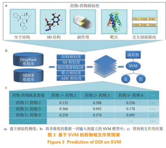 Song 等利用支持向量机模型 (support vectormachine,SVM) 建立了一个机器学习模型。所建立的相似性测度包括二维分子结构相似性、三维结构相似度、相互作用指纹图谱相似性、靶标相似性和ADE 相似性。根据所建立的 5 种相似性度量方法,将已知有作用的药物和可能有作用的药物进行处理,使结构以数据形式表示,并将处理结果作为 SVM的输入向量。SVM 模型建立的思路以及所用数据库如图 3 所示。最终,此 SVM 模型预测准确率达到0.97,远高于之前的 DDI 模型。