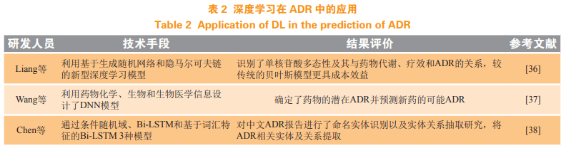 ADR 是一个严重的问题,即尽管给予常规剂量的药物,但仍会出现不良反应。据估计,住院患者中有超过 200 万例发生严重 ADR,每年导致大于 100 000 例患者死亡。因此识别或预测潜在的ADR 显得尤为重要,表 2 介绍了 4 个 DL 在 ADR方面的应用,并对各自的结果进行了简要评价。