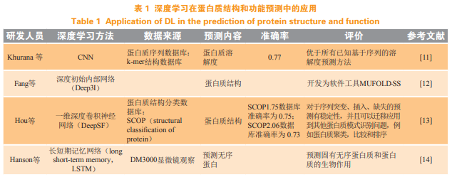 蛋白质的功能研究在生命科学中占据重要的地位,大多数疾病的发生都与蛋白质功能障碍有关。1973 年,Anfinsen发现变性的只保留了一级结构的核糖核酸酶可以重新折叠并恢复生物活性,说明代表蛋白质一级结构的氨基酸序列中隐含了蛋白质二级、三级结构的信息。而蛋白质二级结构预测又可为蛋白质三维结构预测和蛋白质功能预测提供重要信息。因此从一级氨基酸序列预测二级结构及蛋白质的性质是药物研发中的重要任务。表 1 简要列举了 DL 在蛋白质结构和功能预测中的应用。