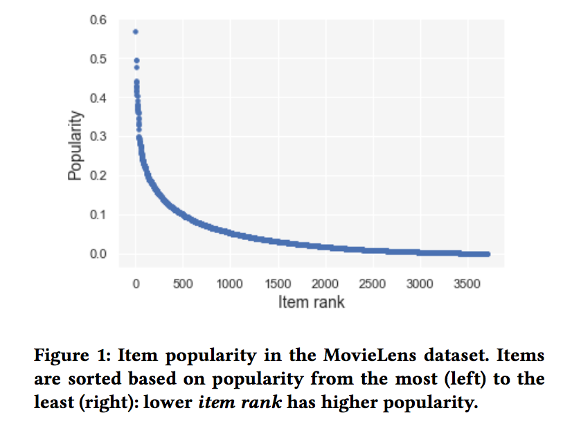 1)输入数据中的偏置,热门物品占据了大部分的数据,而大多数的长尾物品没有用户的交互信息。下图显示了movielens数据中物品的分布情况:
