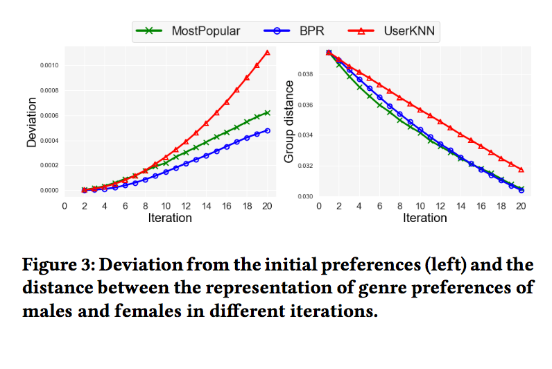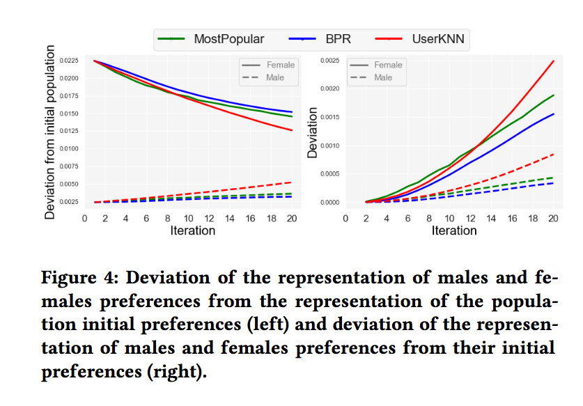 进一步,下图左图代表随着迭代轮次的增加,男性用户和女性用户的打分分布和所有用户初始的打分分布的KL的散度,可以看到,女性用户的打分分布与所有用户的初始打分分布的KL散度越来越小,而男性用户则缓慢增加。右图代表了随着迭代轮次的增加,不同性别的用户的打分分布与该性别用户的初始打分分布的KL散度,可以看到,女性用户的KL散度增加明显高于男性用户。由于男性用户占所有用户的大多数,因此可以说,用户数量较小的类别,其打分分布更容易受到反馈循环的影响。