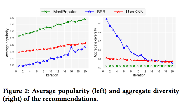 论文首先验证了由于反馈循环的存在,推荐结果不断集中的现象,下图中左图代表了随着迭代轮次的增加,推荐列表中物品的平均受欢迎程度(对于该物品有评分的用户的占比),而右图代表了随着迭代轮次的增加,至少出现在推荐列表中一次的物品的占比。可以看到,随着迭代的不断进行,推荐物品的流行程度越来越高,推荐结果更多的集中在小部分的物品中: