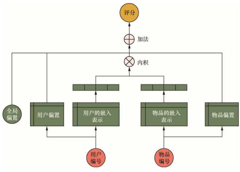 (3)网络结构:矩阵分解的网络结构相对简单,如图11.2所示。图中红色为模型的输入(用户和物品的编号),绿色为可训练的模型参考,黄色为模型输出(评分)。模型大致流程是,先通过用户或物品的 编号查询得到用户或物品的嵌入表示(embedding),而后通过嵌入表 示的内积运算得到一个标量值,再与各类偏置相加,最终得到评分。对 于用户和物品的特有偏置,可以视为一维的嵌入表示。