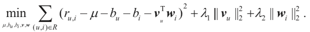(2)优化目标:在评分这类显式反馈数据集上,矩阵分解通常采用均方根误差(Root Mean Square Error)作为损失函数。此外,考虑到用户和物品的数量,以及所选低维稠密向量的维数,矩阵分解的参数空间较大,因而通常会加入 正则项以防止过拟合,具体为