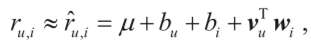 矩阵分解算法是 Simon Funk 在 2006 年的 Netflix 推荐算法设计大赛中提出的一种经典的协同过滤算法,其基本思想是将用户和物品的评分矩阵分解为低维稠密的向量,而分解过程的优化目标是使用户和物品对应向量的内积逼近实际评分,数学形式化为