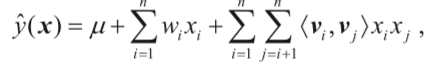 其中, 是输入向量,它一般只有少数几个分量不为0(稀疏特征),典型的例子是在给定户集合和物品集合时,将用户编号和待推荐物品的编号用独热向量表示出来,并将这两个独热向量并联起来就构成了一个稀疏特征输入向量; 是因子分解机的整体偏置; 是 中第 个特征分量的一阶系数; 是第 个特征分量的嵌入向量,而第i个特征分量与第j 个特征分量的交叉系数就是 与 的内积; 都是需要通过训练样本学习得到的参数;是因子分解机的预测输出值。