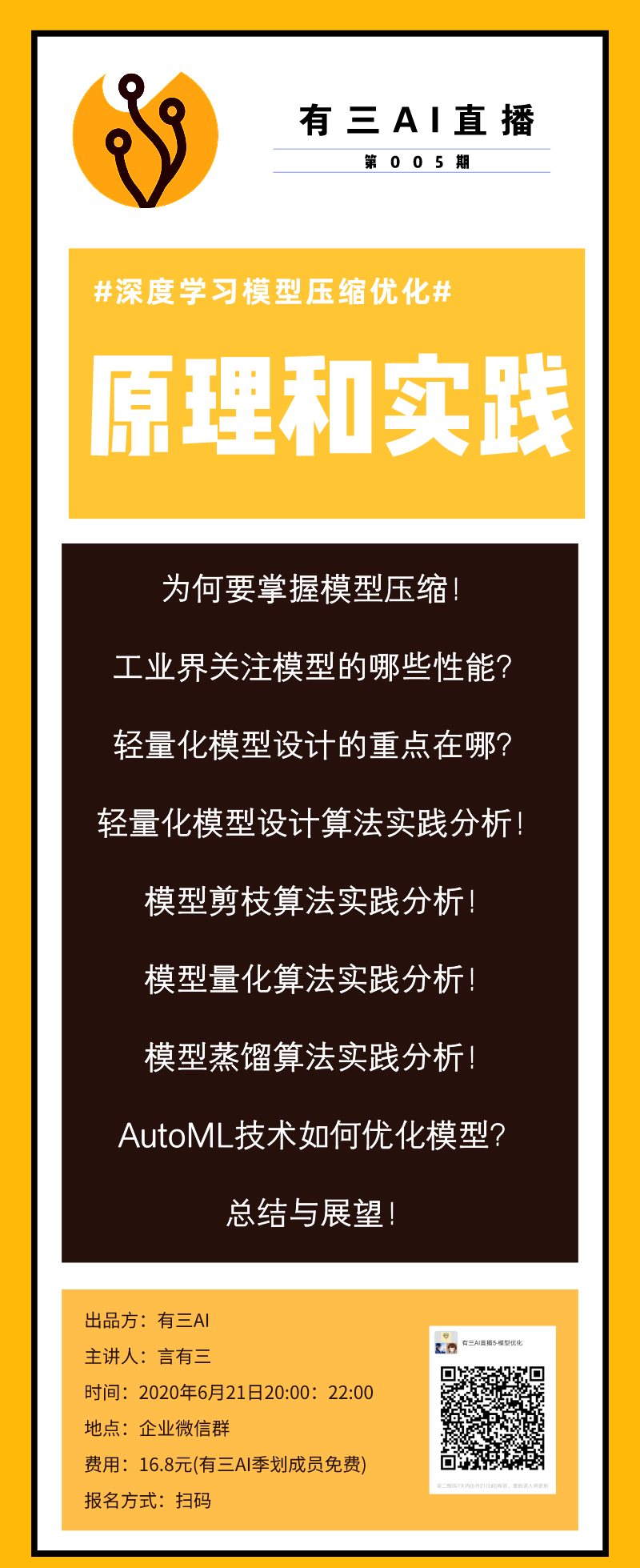 如果大家想要长期稳定地学习模型优化和压缩,完成相关实践,并且能够获得交流和指导,可以考虑加入有三AI秋季划模型优化组,其中学习内容包括数据使用,模型使用和调参,模型性能分析,紧凑模型设计,模型剪枝,模型量化,模型蒸馏,自动化模型设计,模型部署。