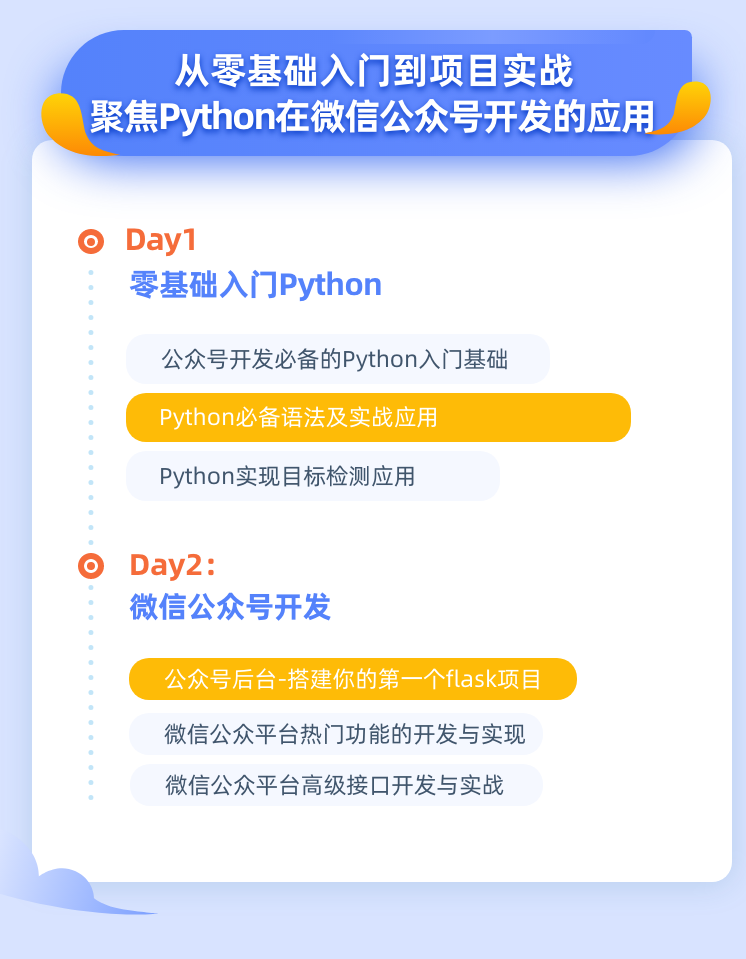 本次训练营为期2天,主要分为两大模块,包括:零基础入门Python、通过Python进行微信公众号开发。