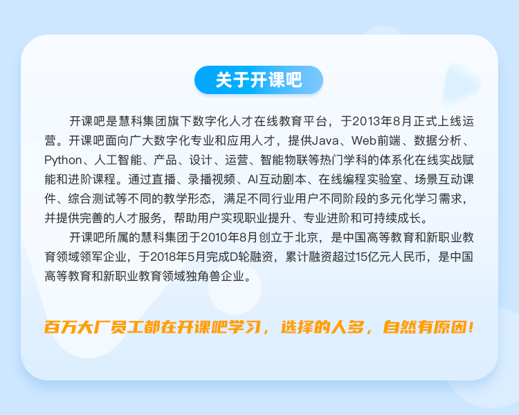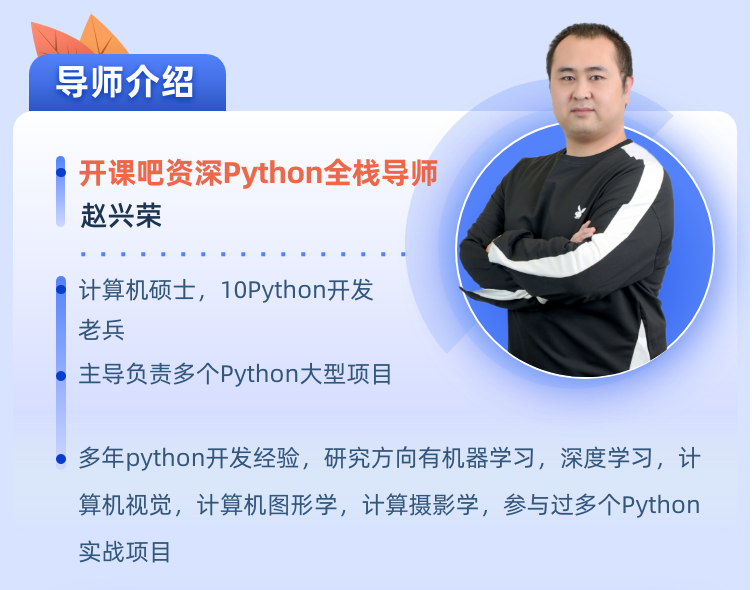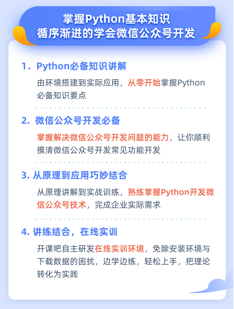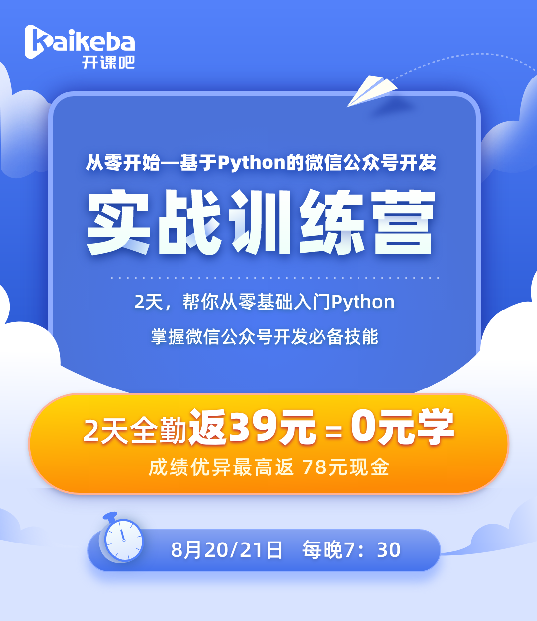 本号强烈推荐你参加《从零开始-基于Python的微信公众号开发实战训练营》,开课吧人工智能高级导师将会从环境搭建到实际应用,从零开始掌握Python必备知识要点,掌握Python开发微信公众号技术,完成企业实际需求。内容不错,推荐给你们。