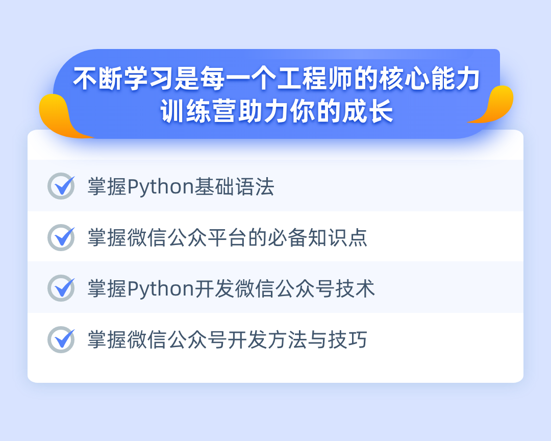 如果你是以上人群,那么这次训练营十分适合你。从Python必备技能点,到微信公众号实际应用,实现进阶发展!