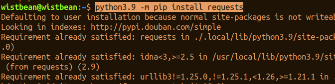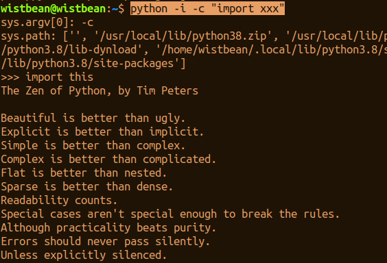 使用 python -m 的一个常用场景是在不同的版本环境中执行相应的模块,比如使用 pip 安装模块的时候:当你使用 -c 命令的时候,还想执行完相关代码后进入 Python 交互模式就可以使用 -i :